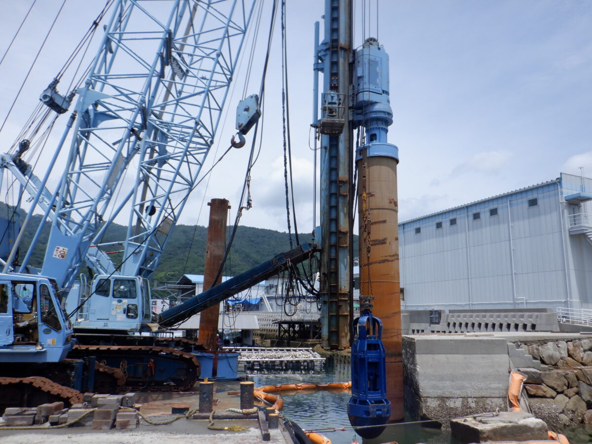 | 内 容 | ・先行掘削置換え工 Φ1500 Lp = 6.63m * 2箇所 ・鋼管杭打設工 Φ1200t = 12L = 14.0m * 2本 |